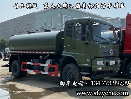 東風(fēng)天錦四驅(qū)森林消防灑水車_國六排放潤知星牌SCS5164GPSDFV6型四驅(qū)越野綠化噴灑車采用DFV2163GP6DJ型國六排放東風(fēng)天錦四驅(qū)越野底盤,東風(fēng)天錦D530一排半駕駛室,4×4驅(qū)動(dòng),康明斯B6.2NS6B210國六發(fā)動(dòng)機(jī)210馬力,最大扭矩850N.m/1100-1700rpm,排量6.2L、韶齒手動(dòng)六檔變速箱,東風(fēng)德納車橋,前驅(qū)動(dòng)橋4.5噸,后橋10噸,10.00R20輪胎,軸距4500mm/4700mm,電動(dòng)玻璃,方向助力,斷氣剎,ABS,大燈自動(dòng)調(diào)節(jié),自動(dòng)調(diào)整臂,選裝原廠空調(diào)。罐體采用優(yōu)質(zhì)碳鋼Q235板材,板材厚度4mm,罐體容積8.7立方,安裝夾心取力器,后置泵箱,消防栓接口左右各一個(gè),消防炮采用PS30-50D消防水炮,流量40L/S/1.0MPa 水射程:≥50m,消防泵采用常壓消防泵型號(hào):CB10/40車用消防泵,流量:40L/s,壓力:1.0MPa,駕駛室頂部安裝長(zhǎng)條警燈帶喊話器,兩側(cè)噴涂白色森林消防字樣。