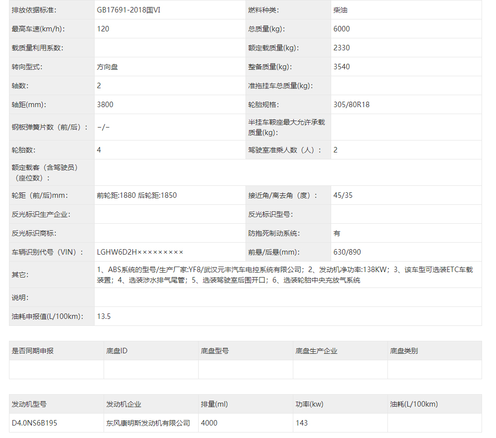 東風(fēng)猛士民用版EQ2063EYY6J型長頭單排四驅(qū)越野底盤其它參數(shù):1、ABS系統(tǒng)的型號/生產(chǎn)廠家:YF8/武漢元豐汽車電控系統(tǒng)有限公司;2、發(fā)動機凈功率:138KW;3、該車型可選裝ETC車載裝置;4、選裝涉水排氣尾管;5、選裝駕駛室后圍開口;6、選裝輪胎中央充放氣系統(tǒng);7、排放依據(jù)標準:GB17691-2018國Ⅵ。