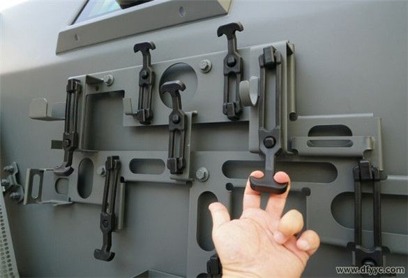 上圖是東風四驅防雷反恐戰(zhàn)車右前側圍懸掛附加工具或補給品的懸掛特寫。用手較費勁的抻拉橡膠懸掛鎖具。備用工具通過橡膠掛具與背板固定在車身側面,背板拆卸后可以成為盤等工具。