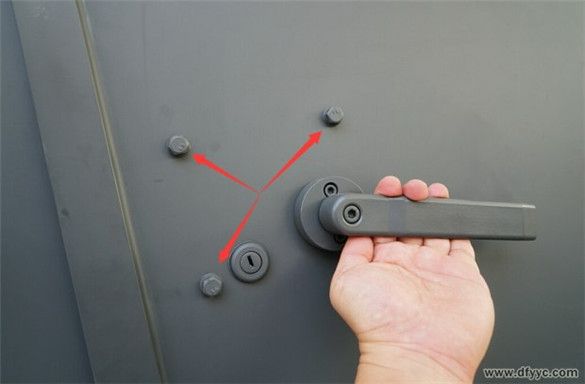 外拉手由上向下旋轉開啟,并采用一字鎖鑰匙鎖閉。紅色箭頭所指的是固定車門鎖具的螺栓。