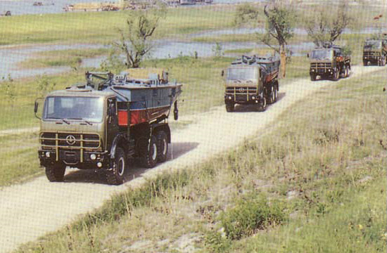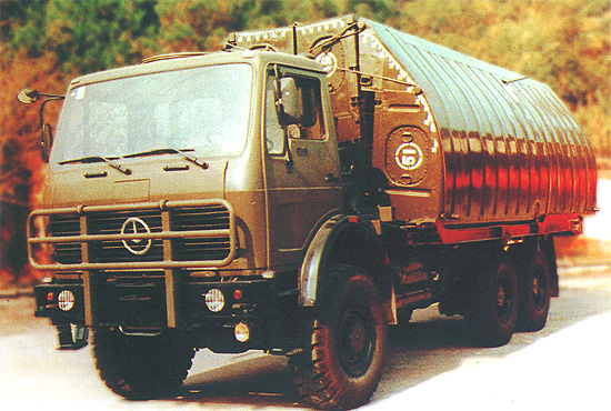 鐵馬XC2200重載卡車在1980年后期進(jìn)入PLA服役,主要用于運輸重型工程設(shè)備和武器系統(tǒng)。中國鐵馬(Tiema) XC2200重載卡車由西南汽車廠(現(xiàn)在北方- 奔馳卡車公司分部)制造,位于重慶(Chongqing)市。卡車以德國梅賽德斯-奔馳2060型卡車為基礎(chǔ)。目前卡車在PLA服役中,被當(dāng)做重型工程設(shè)備卡車和武器系統(tǒng)車底盤。PLA在1970年后期訂購了少量的德國梅賽德斯-奔馳2026型重載卡車(8噸的容量,6X6)補充它不足的重載卡車。這些卡車主要地用于重型火炮拖車任務(wù)。PLA對車輛的性能印象深刻,并且接洽梅賽德斯- 奔馳公司去得到許可在中國聯(lián)合生產(chǎn)卡車。鐵馬XC2200(最初即是TM-SC2030)的發(fā)展,梅賽德斯- 奔馳2060型的一個中國仿造型,從1980年早期開始。 西南汽車廠,一個中國北方工業(yè)總公司(NORINCO)位于重慶(Chongqing)市的下屬公司,被選擇當(dāng)做主承包商。1982年看到了原型的介紹。稍后在1985年中國從西德引進(jìn)了ZF機械變速箱和KHD413風(fēng)冷柴油發(fā)動機技術(shù),兩者在鐵馬XC2200卡車上被采用。XC2200批量生產(chǎn)在1986年開始,每年從生產(chǎn)線上生產(chǎn)2,000輛。大多數(shù)的這些車輛被PLA接收用于重貨物/設(shè)備運輸、火炮拖車和武器系統(tǒng)車底盤。車輛包括在西藏高地、戈壁沙漠和中國最惡劣的道路和天氣狀況區(qū)域展示了優(yōu)良性能和可靠性。除了被PLA部署,車輛也被輸出到巴基斯坦、泰國、印尼和斯里蘭卡。XC2200采用雙車門正向控制駕駛室,位于發(fā)動機艙上面。駕駛室有四個座位和在頂板有一個天窗。后面的貨物車身的后擋板和側(cè)擋板可放下,可拆卸蓬架和帆布蓬。單預(yù)備輪被垂直地安裝在乘員室后面,靠近載貨車箱在駕駛室和后貨物車體之間。這一個空間能用來容納一個修理工具箱和其它的裝載/卸貨設(shè)備。與第一代中國自行生產(chǎn)的重型臺車相比較,XC2200有好很多的通用性能,連同85公里/小時的最大道路速度和一個8噸的越野裝載能力。ZF5S-110/111 GPA變速箱有九個前進(jìn)檔和一個倒車檔。三個車軸和六個車輪全部運行使用速度差速器鎖定裝置,即使當(dāng)車輛的一側(cè)上一個或更多的車輪沒有與地面接觸中,或已經(jīng)失去牽引,確保車輛持續(xù)驅(qū)動。除了基本的貨物卡車改型之外,XC2200也可得到許多其它的改型, 包括4X4、8X8、長軸距貨車、起重機、掩護(hù)所、架橋車、運船車、道路鋪設(shè)車和多種武器系統(tǒng)車底盤。中國也已經(jīng)發(fā)展基于XC2200設(shè)計的WZ551輪式裝甲人員輸送車(APC)。鐵馬XC2200浮橋架橋卡車。鐵馬XC2200用于WS-1多管火箭發(fā)射裝置車底盤。鐵馬XC2200用于運船車。