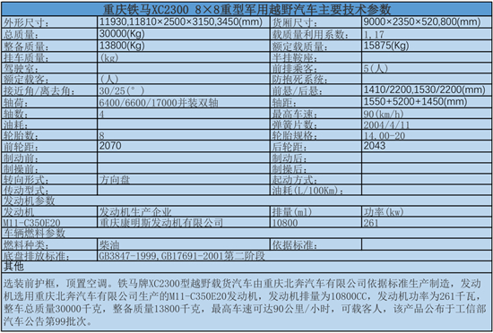 鐵馬牌XC2300型越野載貨汽車由重慶北奔汽車有限公司依據(jù)標(biāo)準(zhǔn)生產(chǎn)制造,發(fā)動機選用重慶北奔汽車有限公司生產(chǎn)的M11-C350E20發(fā)動機,發(fā)動機排量為10800CC,發(fā)動機功率為261千瓦,整車總質(zhì)量30000千克,整備質(zhì)量13800千克,最高車速可達(dá)90公里/小時,可載客人,該產(chǎn)品公布于工信部汽車公告第99批次。