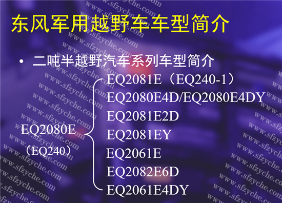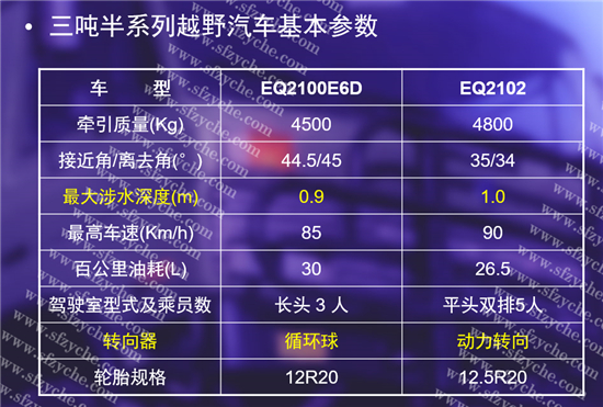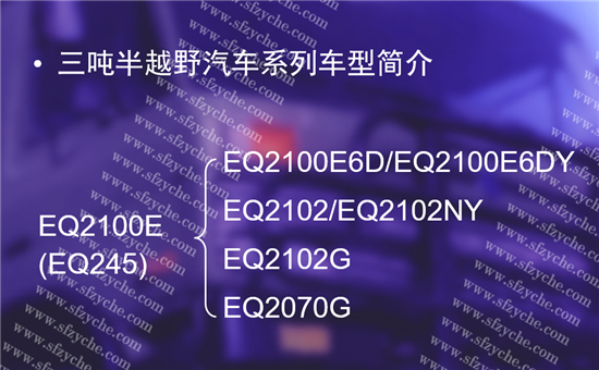 EQ2100E6D車型簡介:EQ2100E6D型三噸半越野汽車是EQ2100E車型的改進型,該車型于1995年設計定型,1996年投產(chǎn)。主要進行了如下7項改進設計:換裝康明斯6BT5.9型增壓柴油發(fā)動機、采用350單片離合器,液壓氣助力操縱、采用動力轉向系統(tǒng)、采用中央彈簧氣室駐車制動 、 采用發(fā)動機進氣預熱冷起動裝置  、24V電氣系統(tǒng)及符合法規(guī)的新式電器、儀表和開關 、改進駕駛室總成。