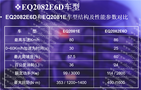 EQ2082E6D型二噸半越野汽車是EQ2081E(EQ240)車型的改進型,2000年9月設計定型,2001年4月投產(chǎn)。該車型以EQ2081E為基礎,針對EQ2081E車型多年來在使用中所暴露出的問題與不足,并充分利用東風公司近年來在其它車型上研制開發(fā)的成熟總成及結構,主要進行了如下8項改進設計:1.換裝康明斯6BT5.9型降扭矩增壓柴油發(fā)動機、2.采用350膜片彈簧離合器,液壓氣助力操縱、3.采用動力轉向系統(tǒng)、4.采用吊掛式踏板操縱機構、5.采用電動雨刮器 、6.采用24V電氣系統(tǒng)及符合法規(guī)的新式電器、儀表和開關、 7.改進駕駛室總成、8.采用PTC進氣預熱冷起動裝置。