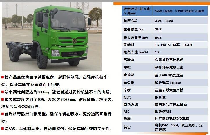 EQ2070GZ4DJ越野四驅(qū)底盤的詳細(xì)描述:該產(chǎn)品底盤為四驅(qū)越野底盤,越野性能強(qiáng),高強(qiáng)度抗扭車架,保證車輛在復(fù)雜路面上行駛時(shí),不會(huì)出現(xiàn)大梁斷裂等情況;最小離地間隙達(dá)到300mm,能輕易通過泥濘坑洼不平的山路;最大爬坡度達(dá)到了60%,適應(yīng)陡峭、坡度大、坡多等復(fù)雜路況行駛。前后橋帶防滑自鎖裝置,確保車輛在積水、泥濘道路正常行駛;帶ABS、盤式制動(dòng)器、自動(dòng)調(diào)整臂,保證車輛行駛的安全性。