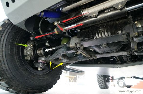 東風(fēng)四驅(qū)裝甲防雷反恐戰(zhàn)車為前置動力、實(shí)時四輪驅(qū)動設(shè)定,縱置發(fā)動機(jī)(白色箭頭)直接與變速器(綠色箭頭)剛性連接,通過中間傳動軸(黃色箭頭)至分動器,在經(jīng)過前傳動軸(紅色箭頭)與后傳動軸將動力輸出至前后驅(qū)動橋。